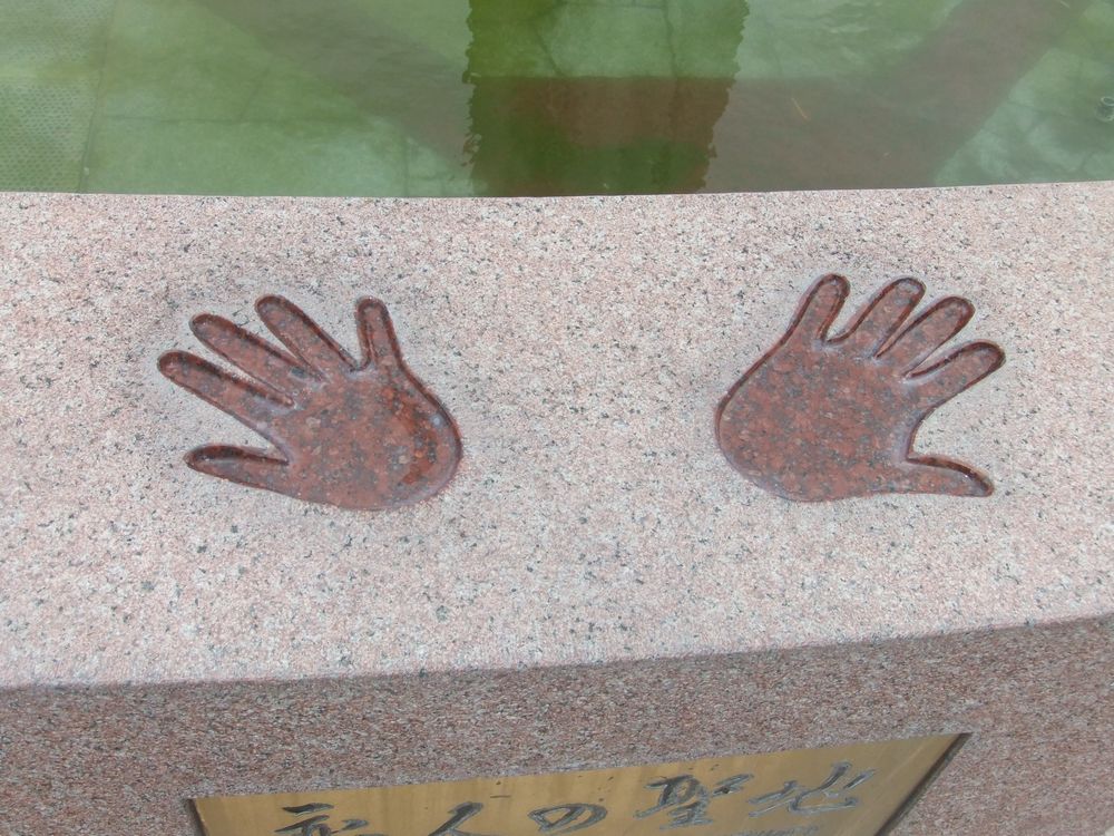 ブライダルデザイナーの桂由美がデザインした手形の銅板レリーフと噴水。