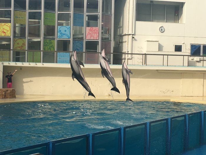 イルカのショーは、3頭で行われ、ボールを跳ね返したり、高速で泳いだり、輪っかを作ったりアクティブなものが多かった。