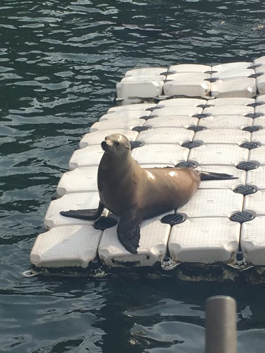 台からカップを持って眺めているとアシカが気づいて寄ってきます。