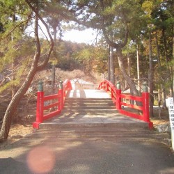 敷地の入口に架っている赤い橋は森町指定文化財の「龍門橋」。