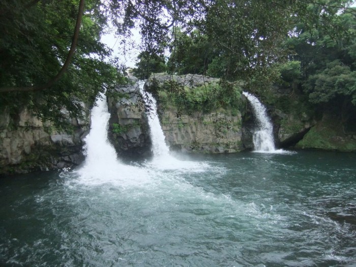 左側から「雪解」、「富士見」、「月見」。そして玄武岩溶岩流の断面に流れる滝・・・