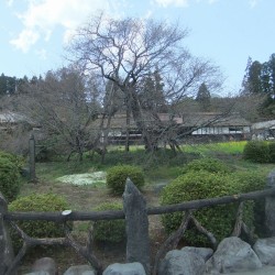 周辺の田畑には同時期に開花する菜の花が植栽され、山桜の薄いピンク色との鮮やかなコントラストを実現させています。
