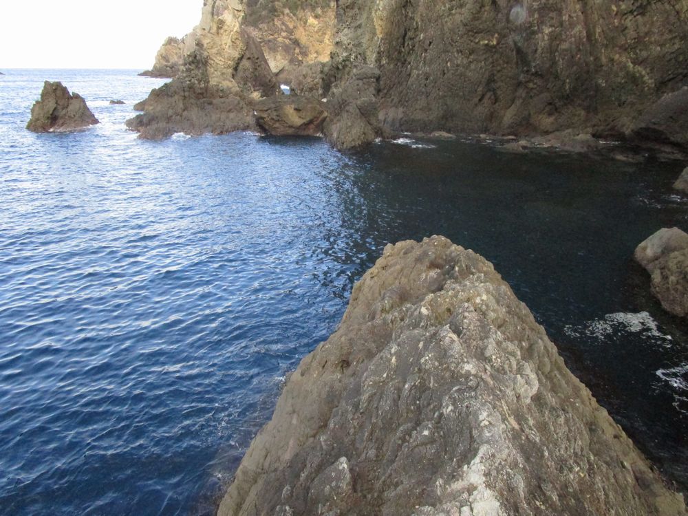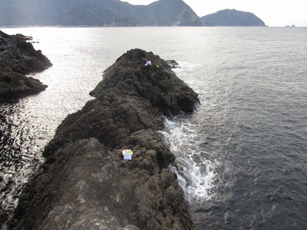 裏の岩壁と同化しているの分かりにくいのですが左下が長根を沖から見たもの。