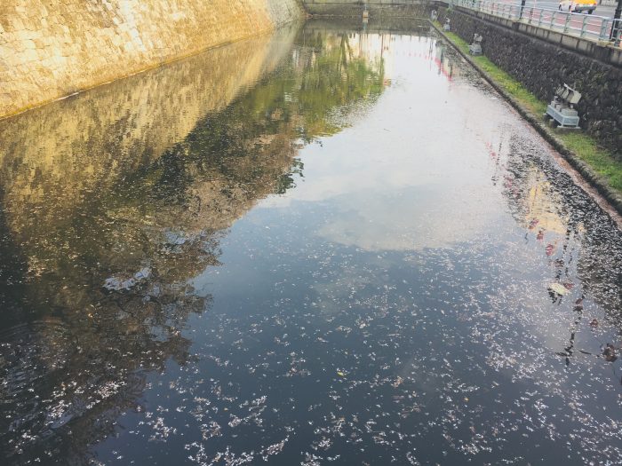 駿府城の城壁は池に囲まれており、毎年城壁に植えられた桜がたくさん咲き、池に花びらの模様を作ります。